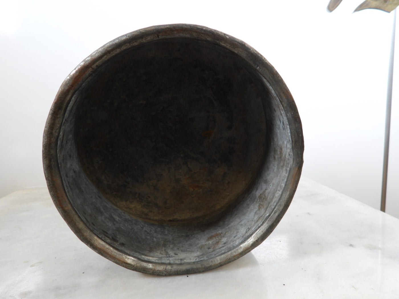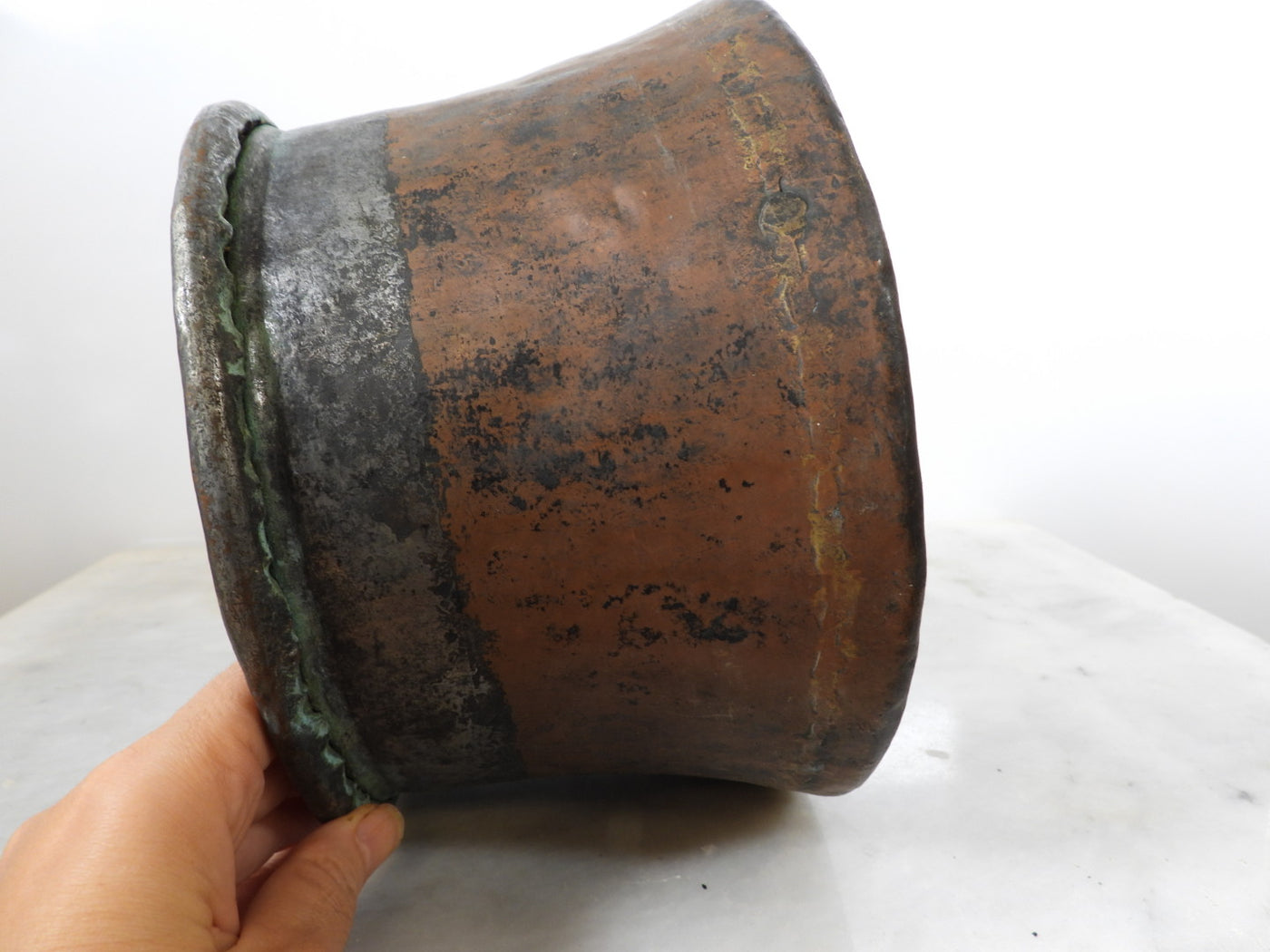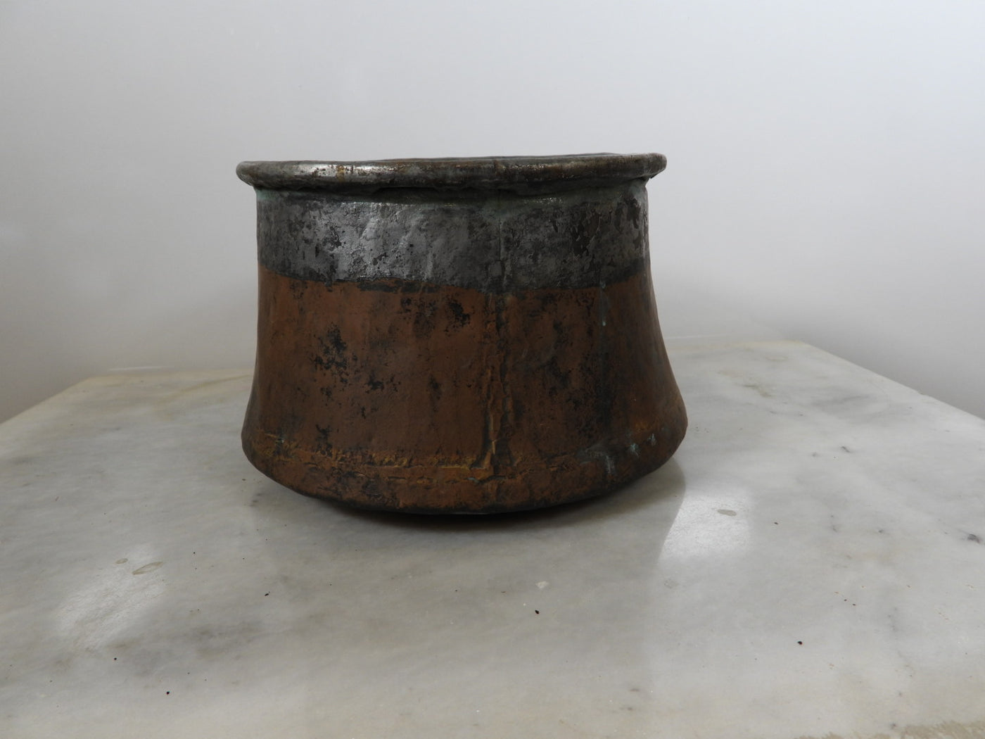 • Lining: The upper interior features a visible, tarnished tin lining.
