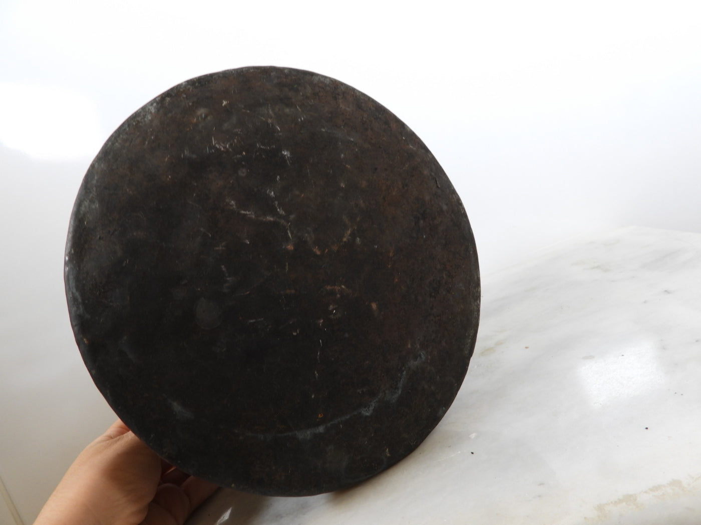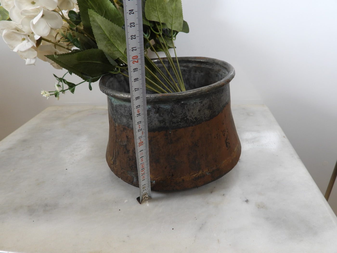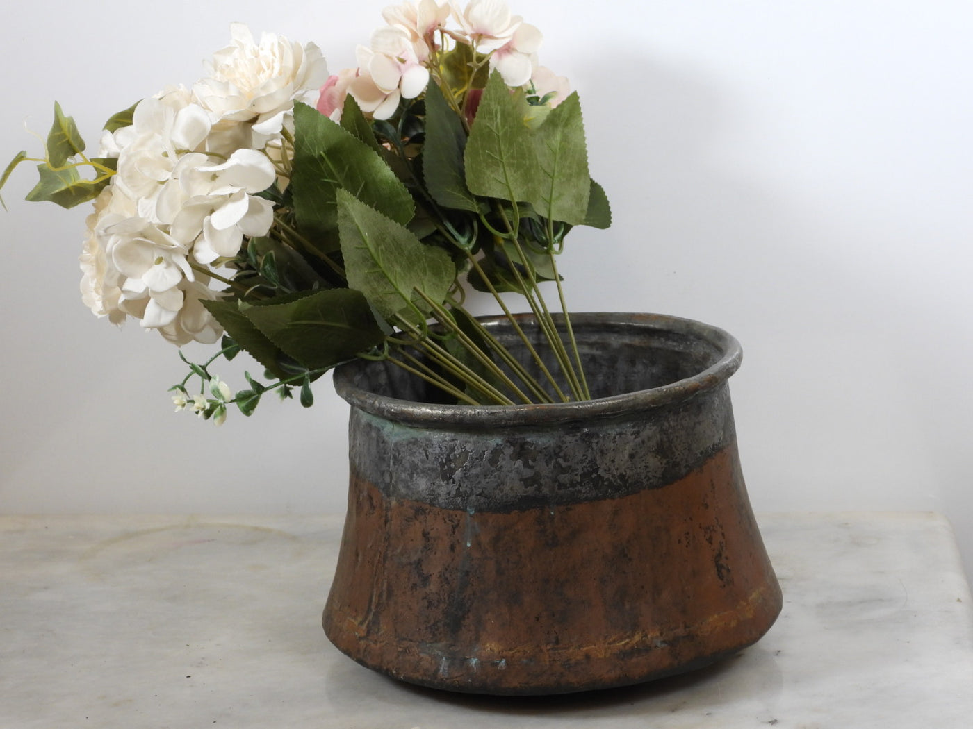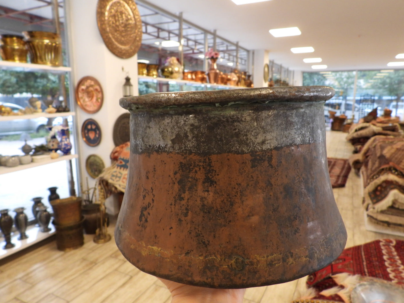 • Lining: The upper interior features a visible, tarnished tin lining.