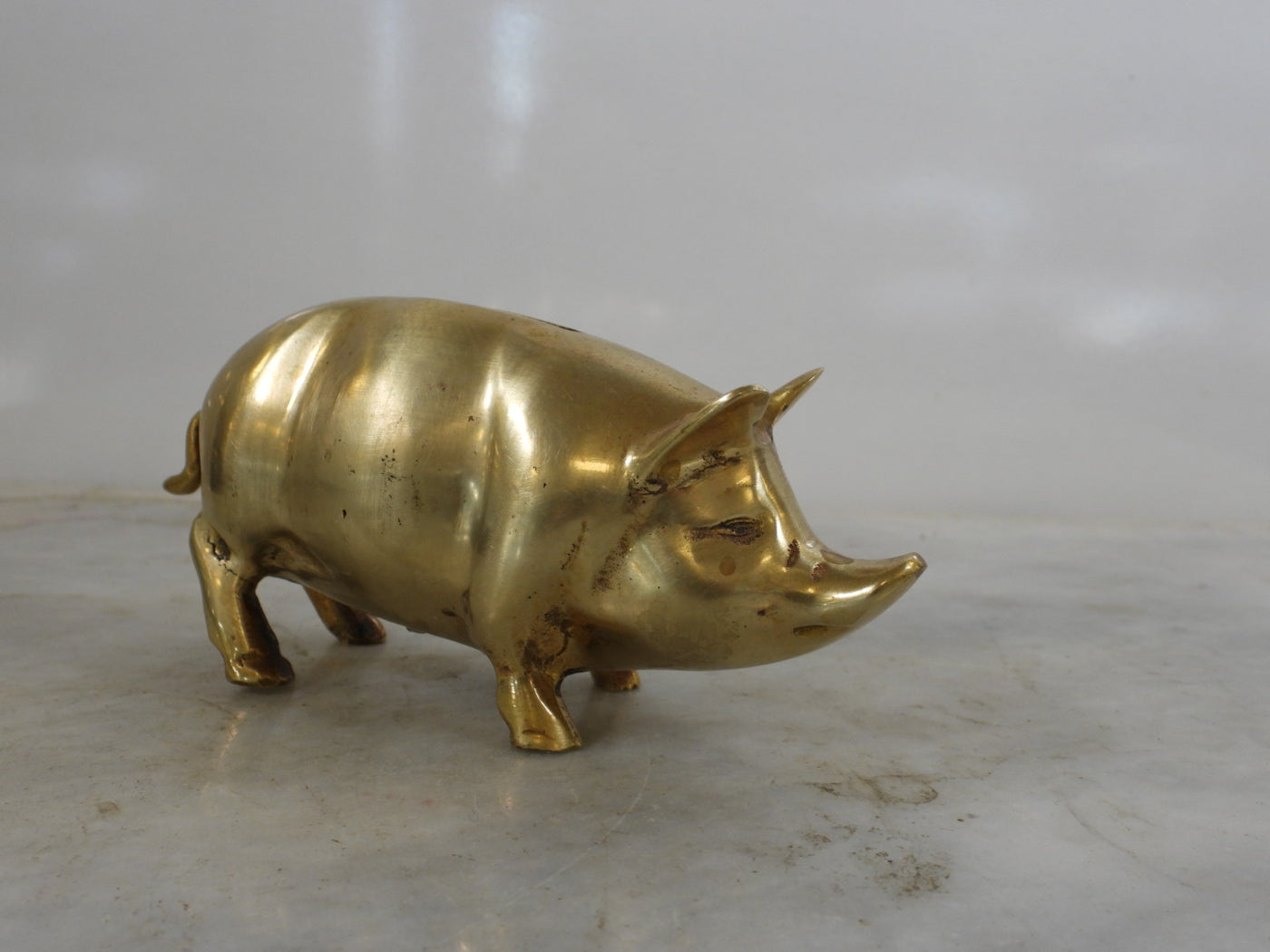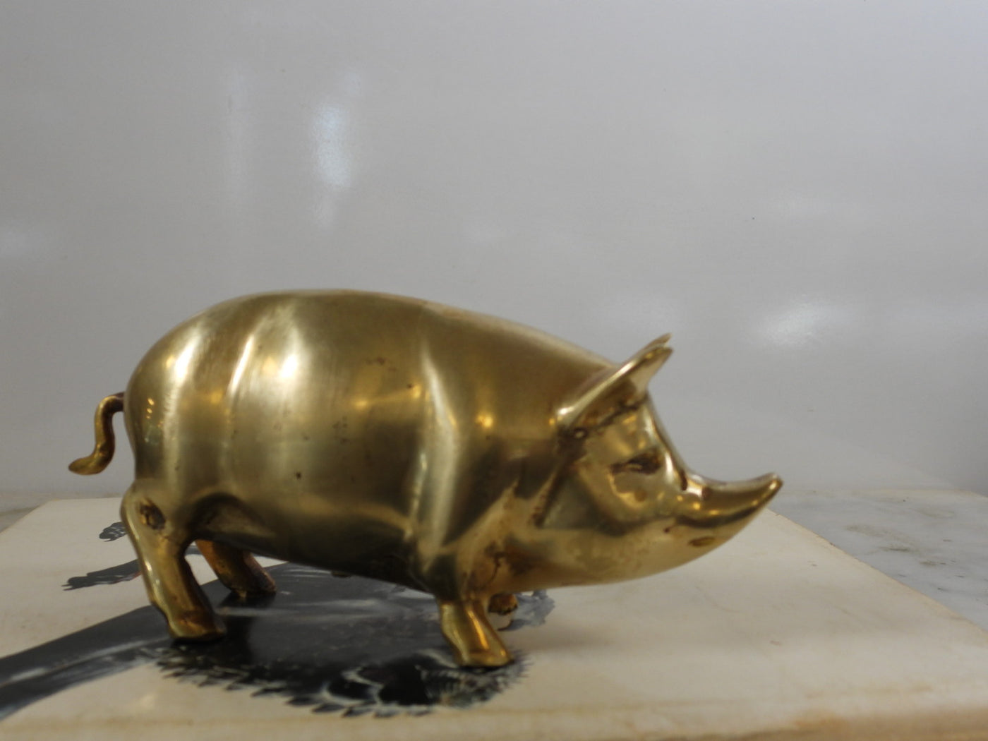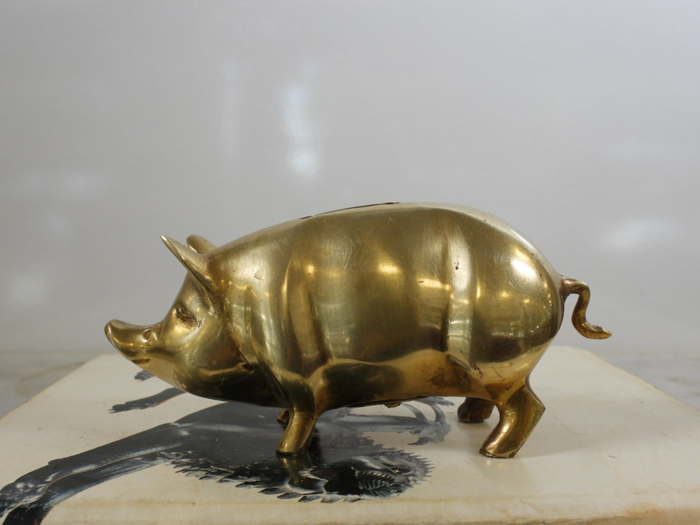The Brass Piggy Coin Bank is a unique and stylish antique piece with an Art Deco design. Made of brass in Turkey, this coin bank features intricate detailing and craftsmanship. Perfect for adding a touch of vintage charm to any collection or decor, this piece is both functional and decorative, making it a standout addition for any enthusiast of antique items.