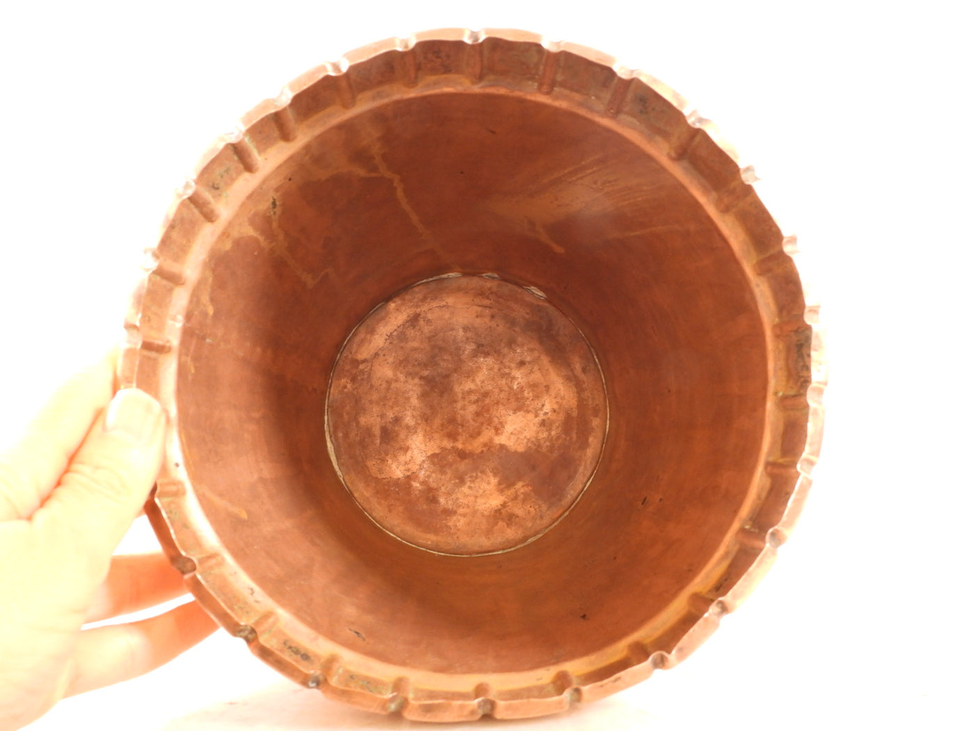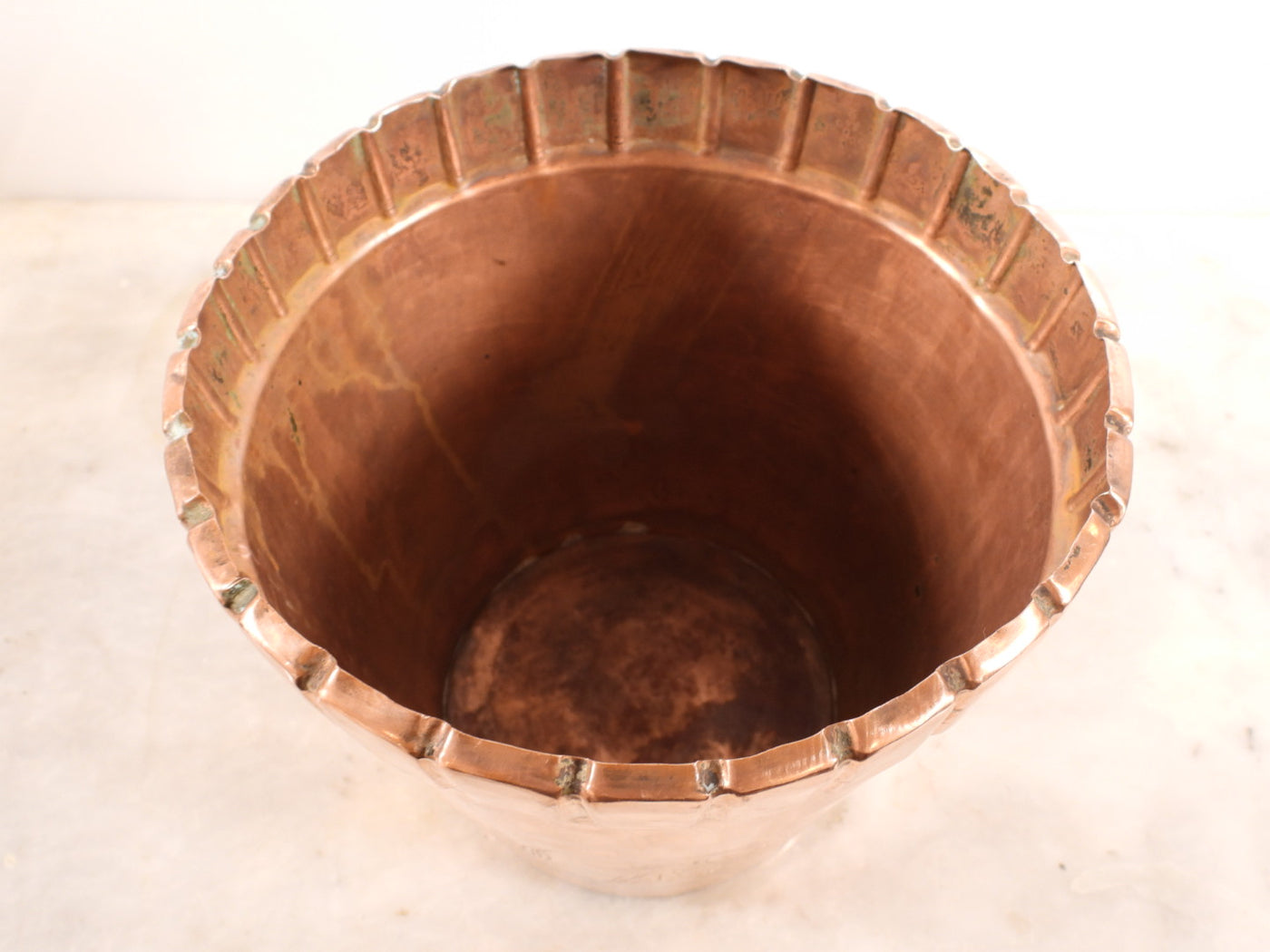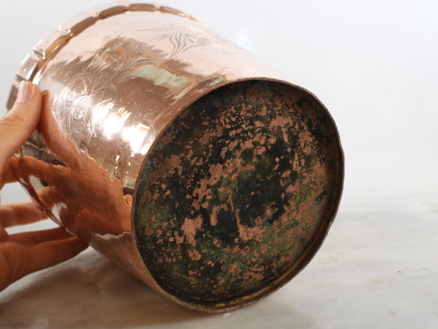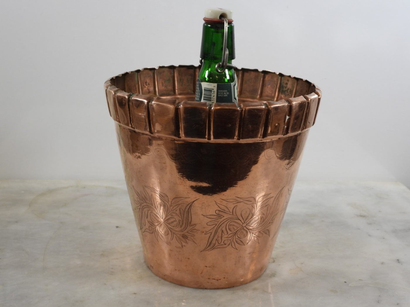 Add a touch of rustic charm to your home with this unique vintage copper bucket. Hand-hammered and featuring intricate floral engravings, this piece is a perfect blend of history and artisanal craftsmanship. Its warm copper tones and textured surface will create a cozy and inviting atmosphere.