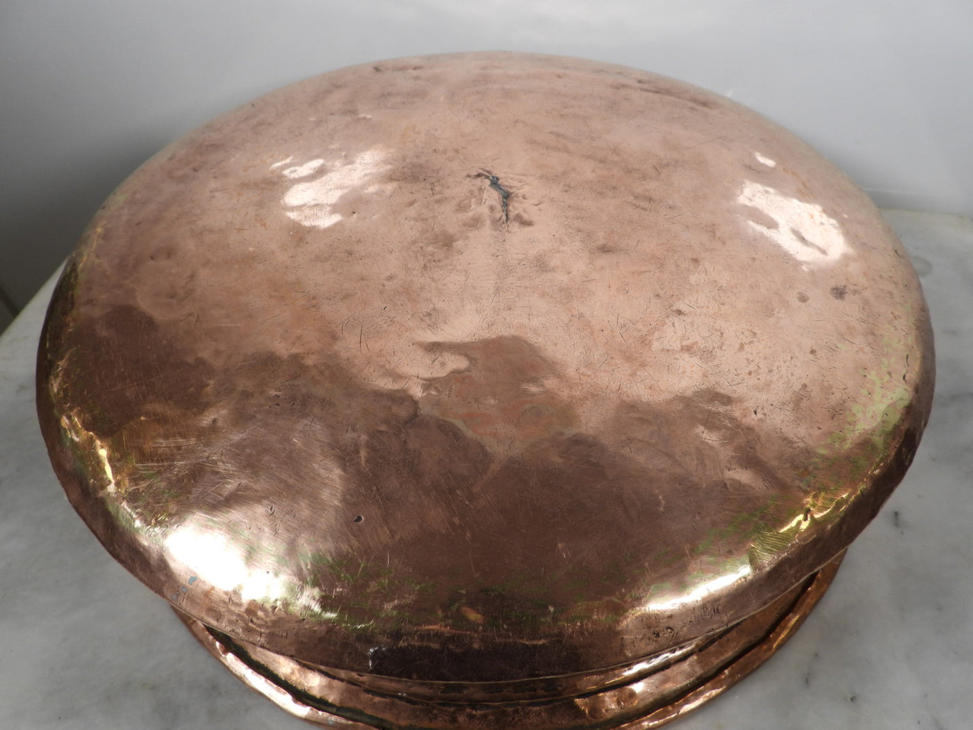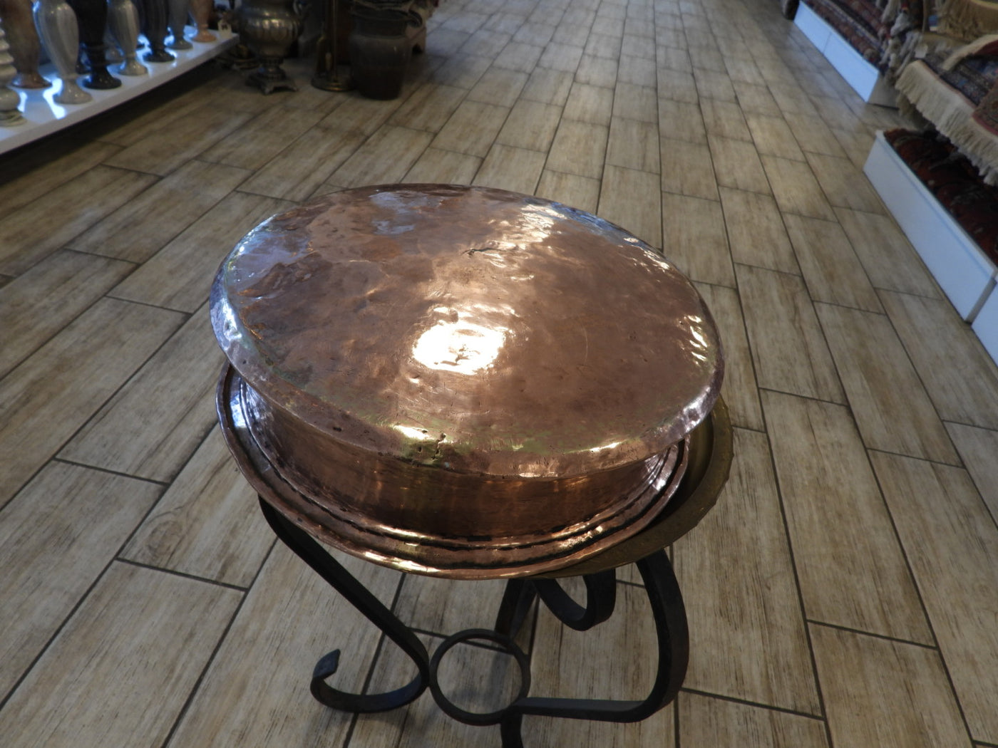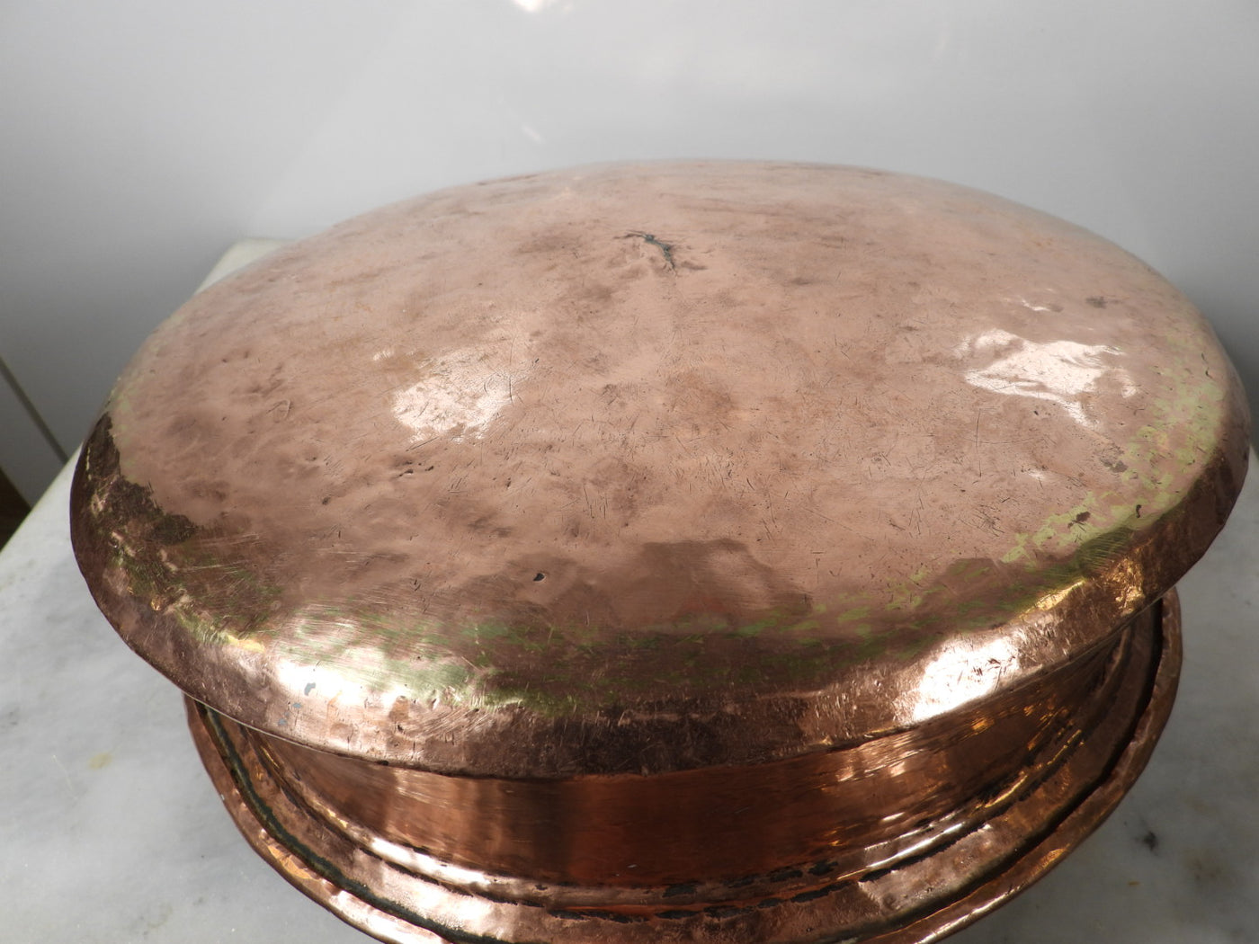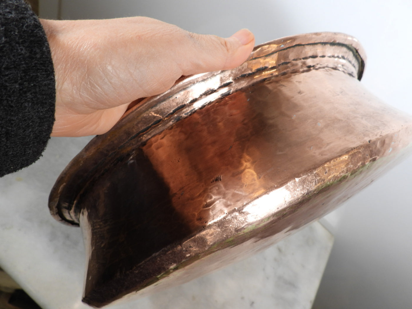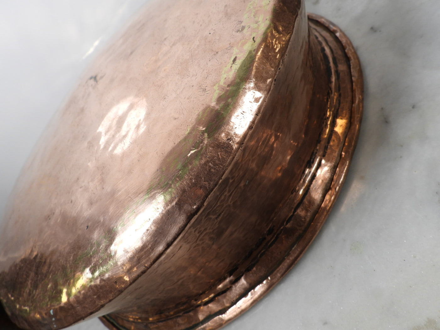 Surface: The interior shows a faded tin lining (kalay) with a beautiful silvery-grey patina, while the exterior has been polished to highlight the rich copper tones.