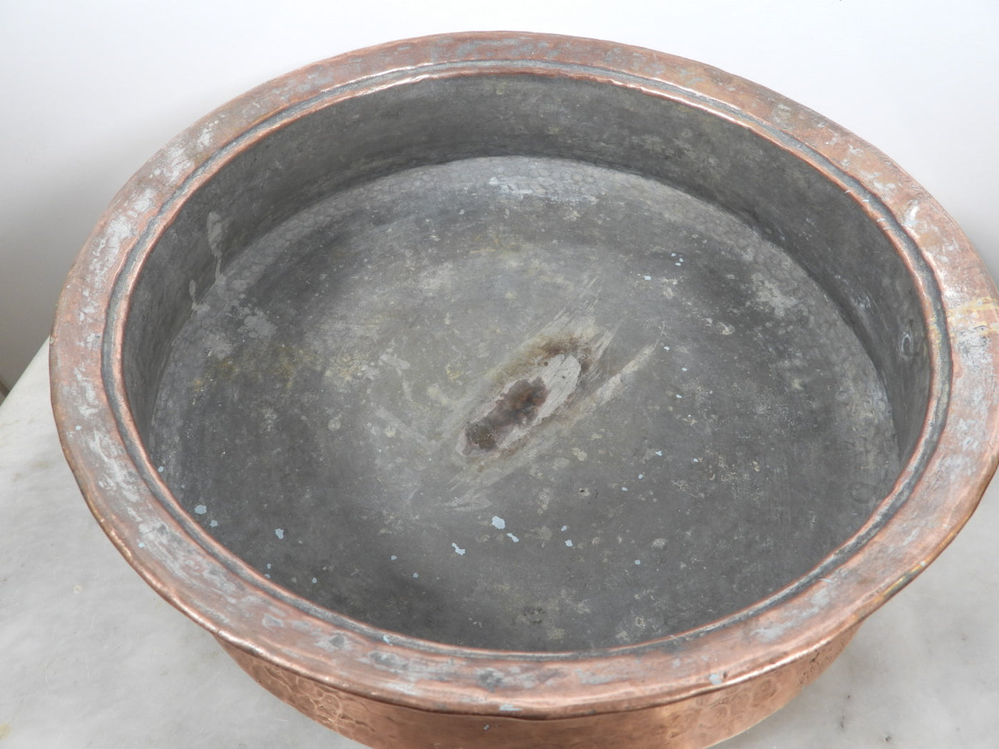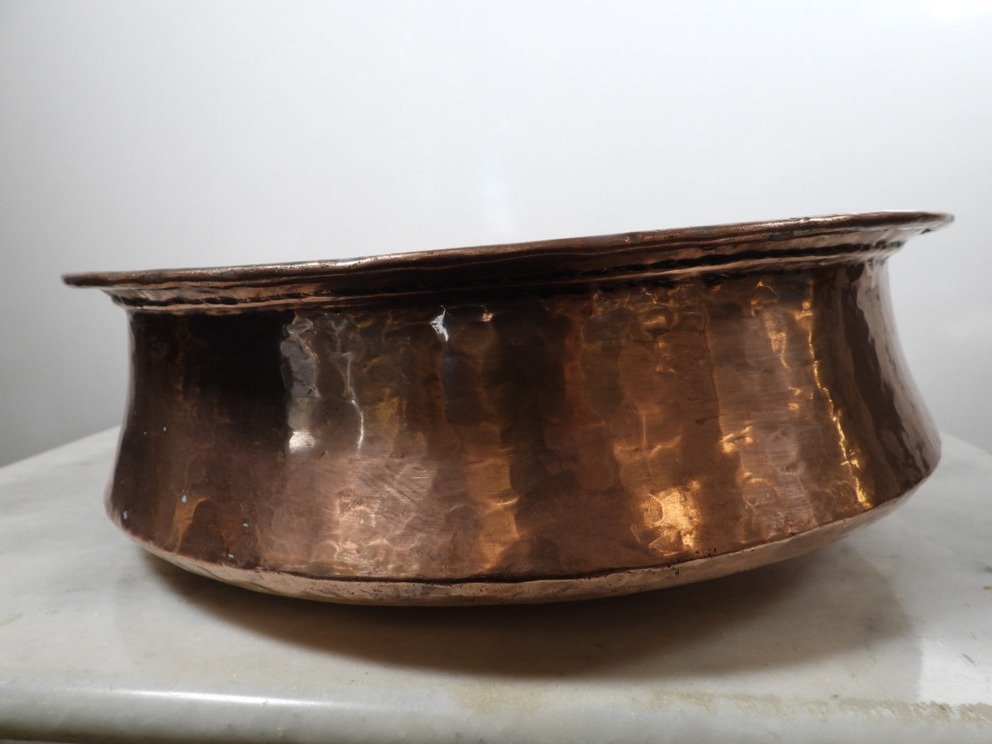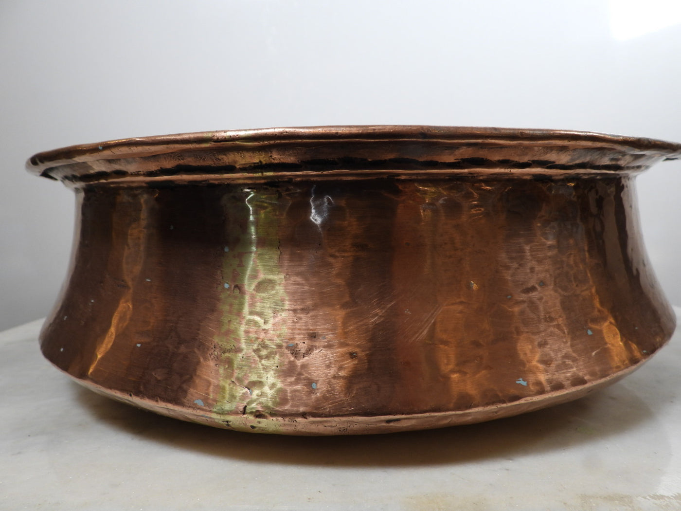 This is a substantial, authentic copper basin (Leğen) featuring wonderful hand-hammered texture and a warm, aged glow. Traditionally used for washing or kitchen tasks, this heavy-gauge copper piece is a perfect example of primitive metalwork.