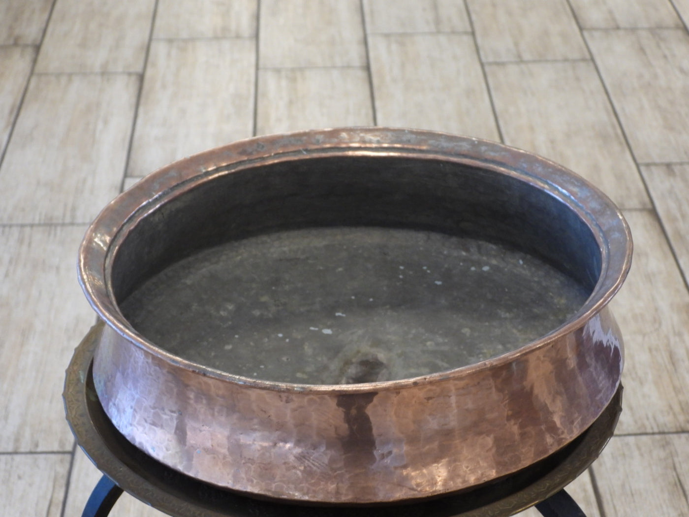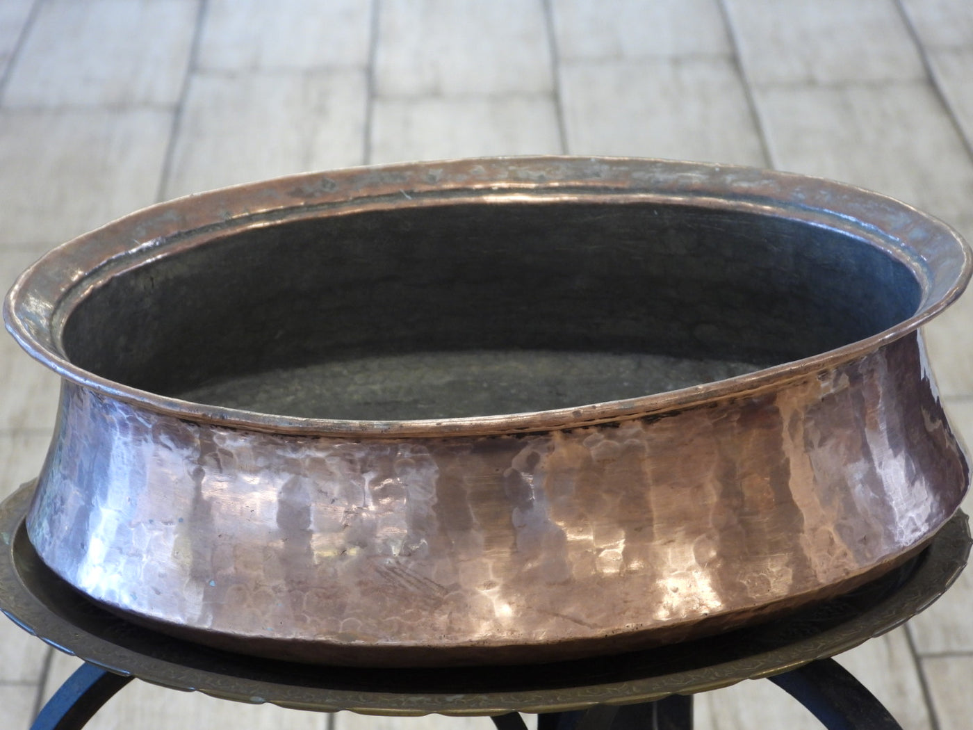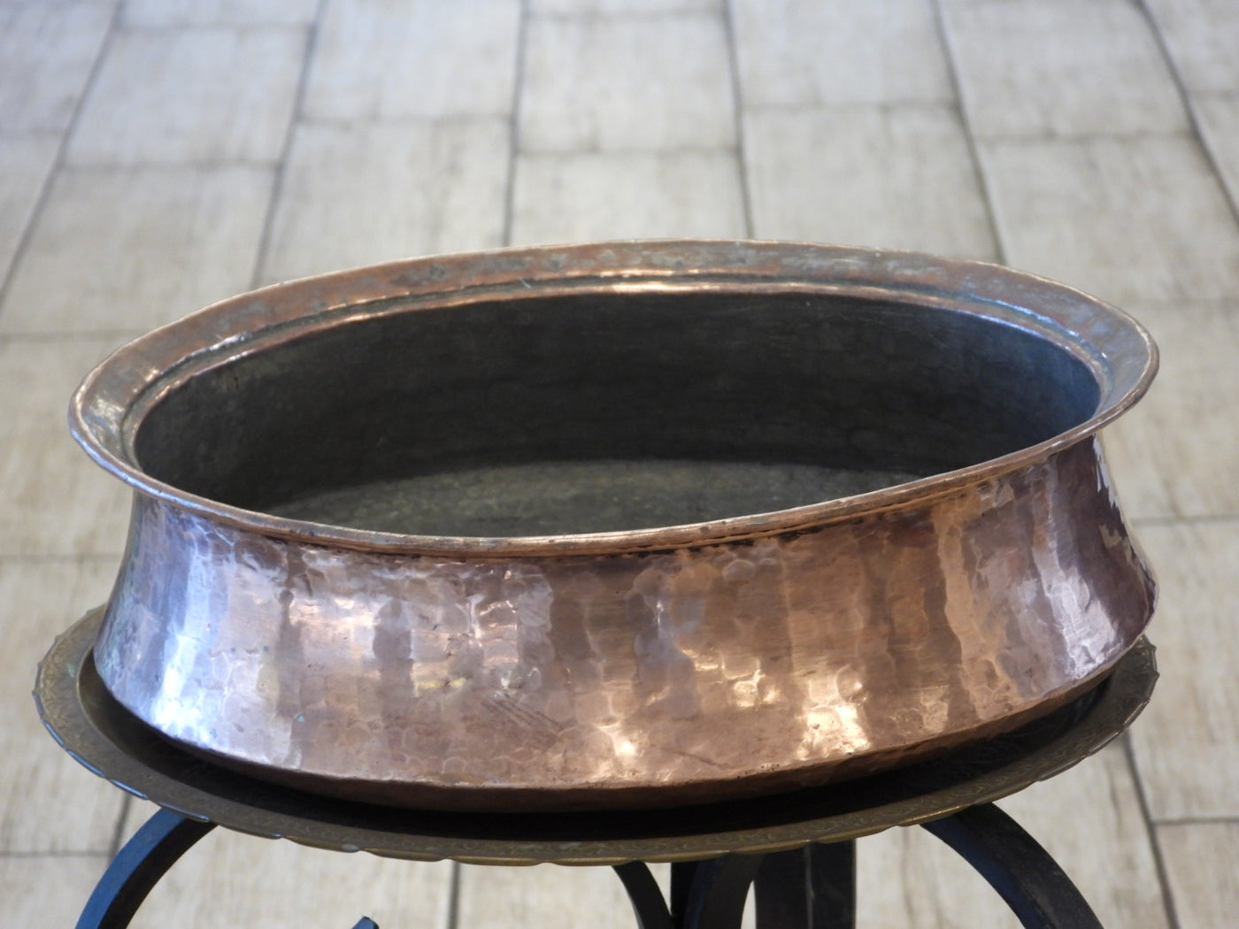 This is a substantial, authentic copper basin (Leğen) featuring wonderful hand-hammered texture and a warm, aged glow. Traditionally used for washing or kitchen tasks, this heavy-gauge copper piece is a perfect example of primitive metalwork.
