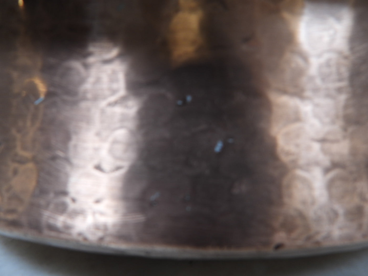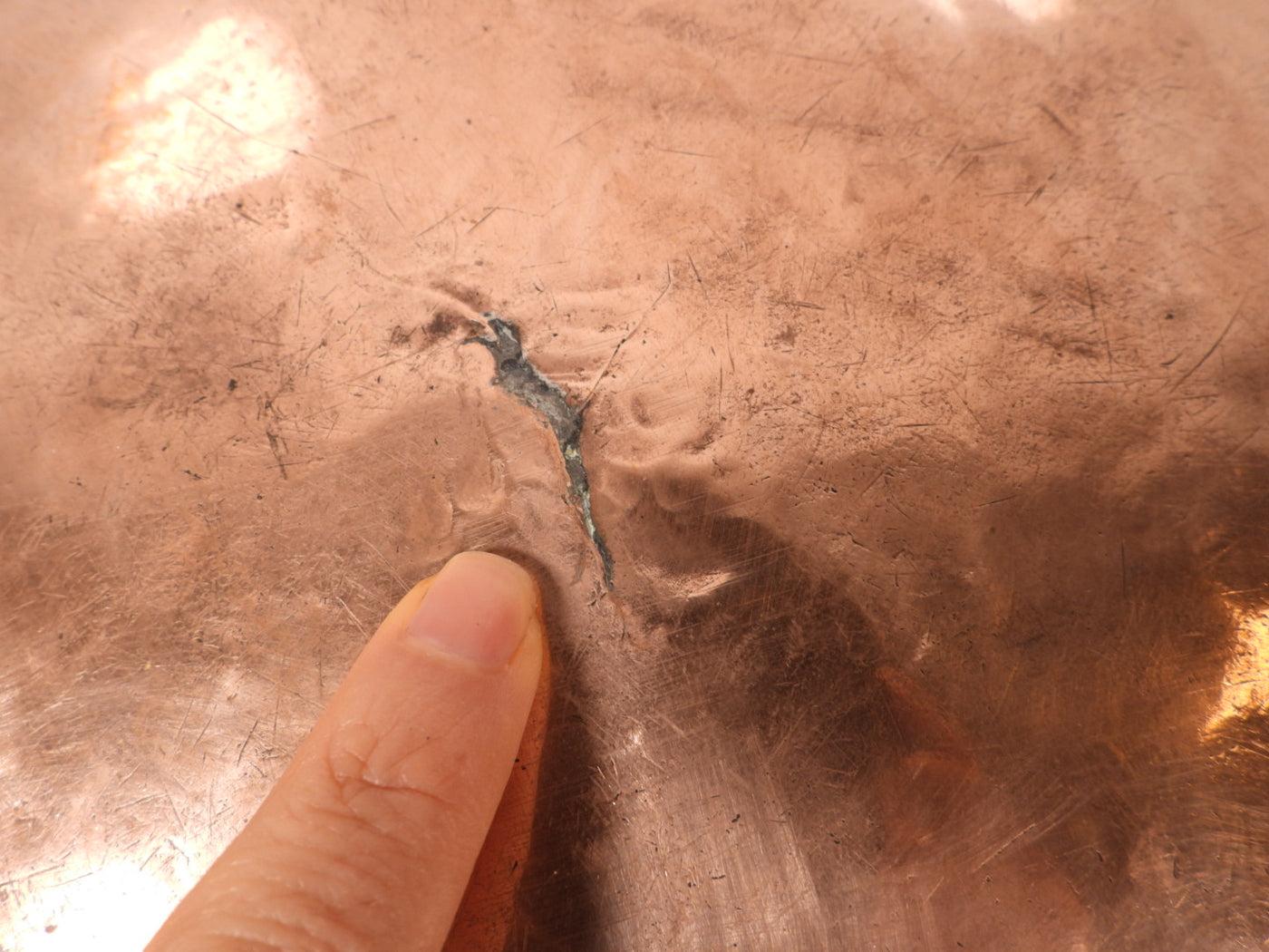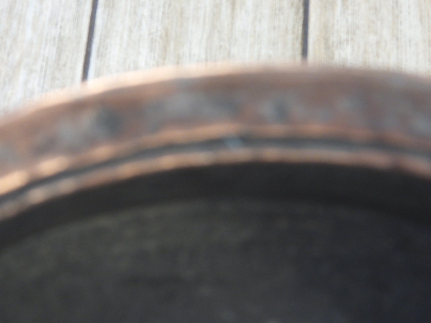Historical Repair: There is a visible repair (patch/soldering) located right in the center of the base, as shown in the close-up photos. This is an old, functional repair that adds immense character, showing how much the item was valued and kept in use.