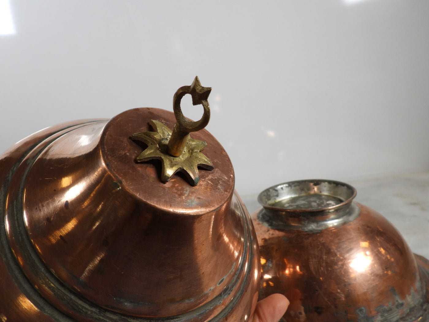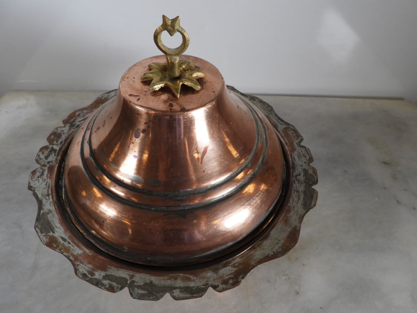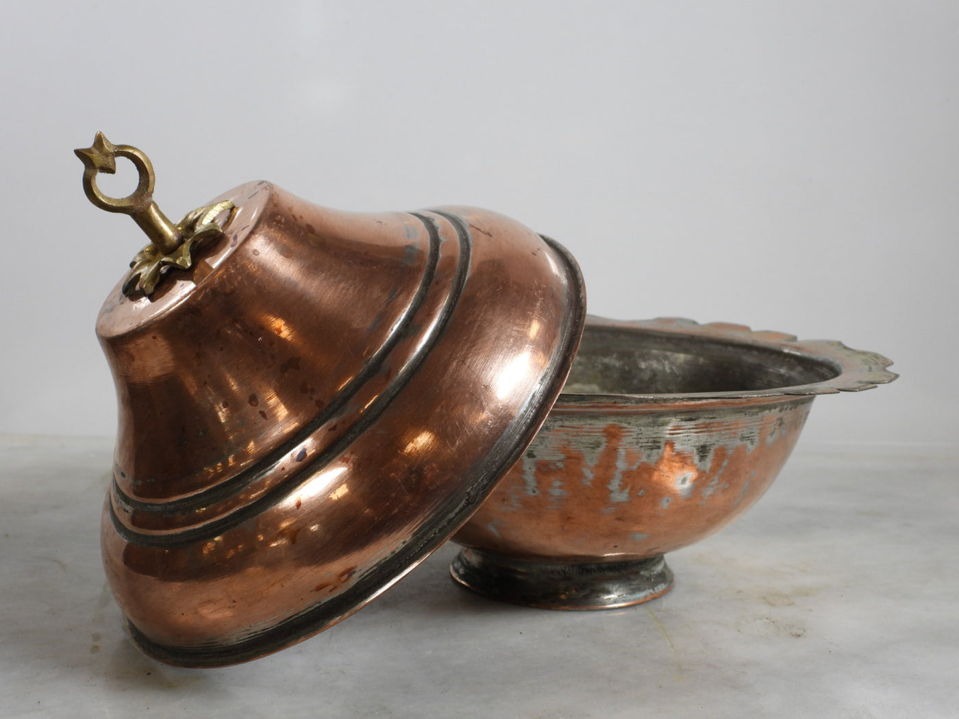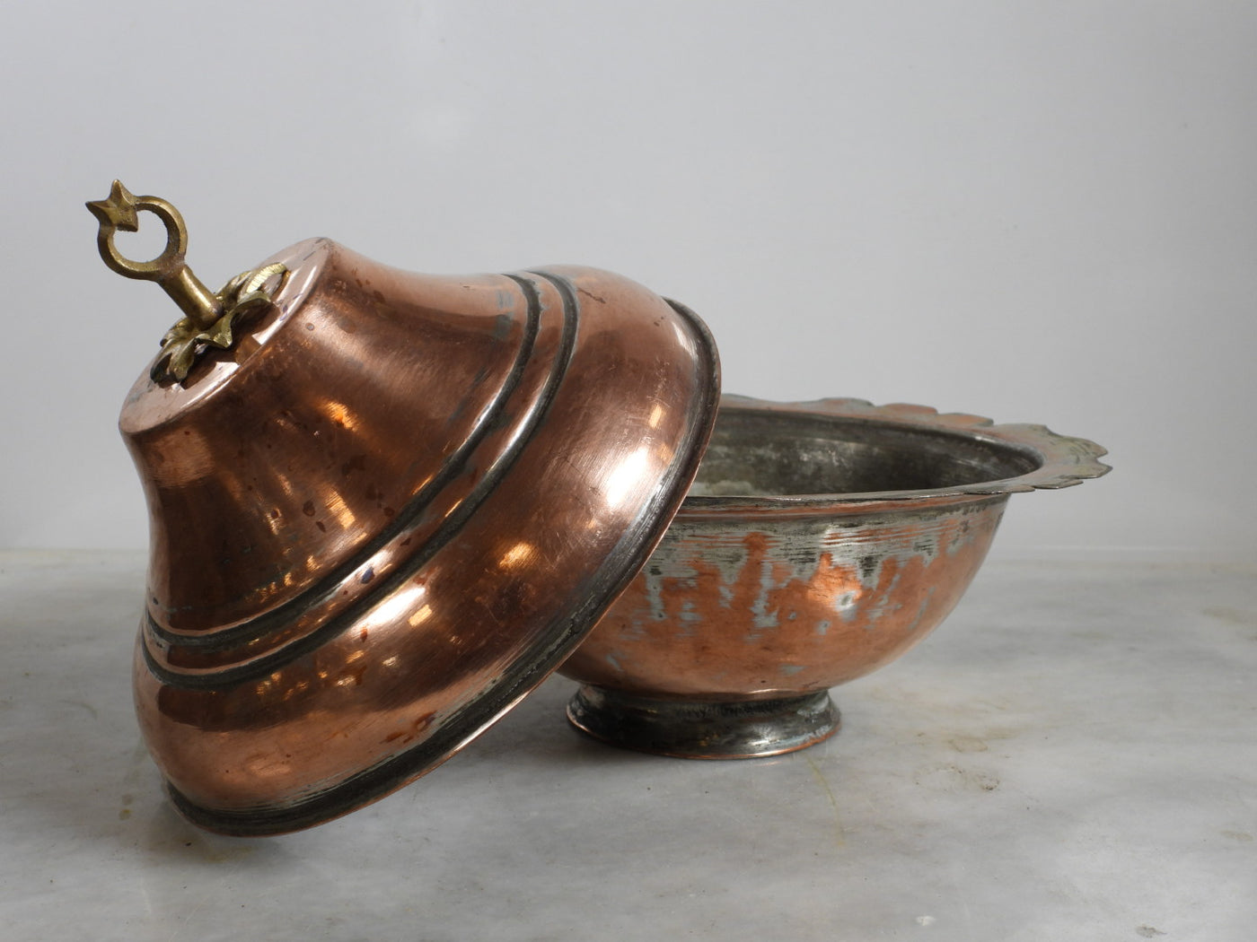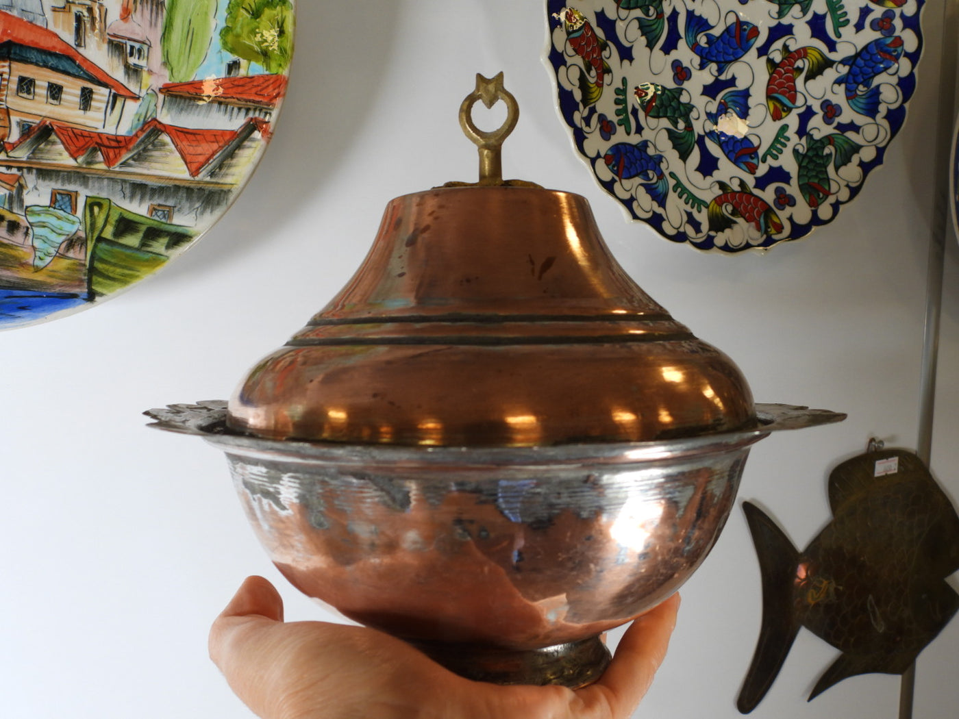 This is an attractive, vintage, tinned copper serving dish, distinguished by its classic Turkish design and brass star lid finial.