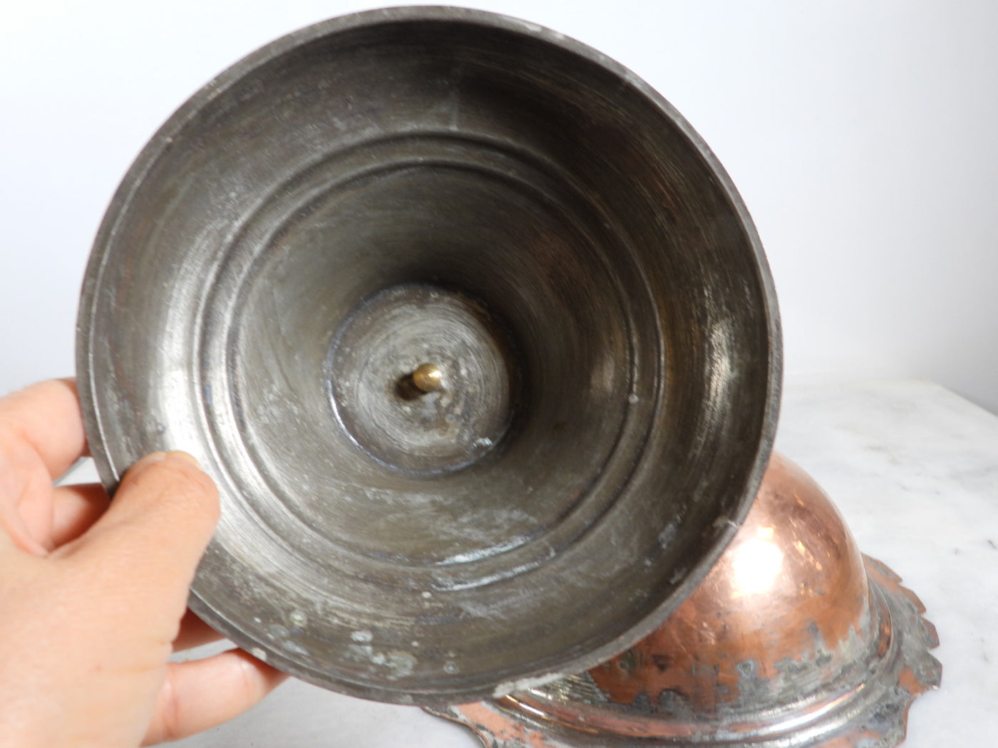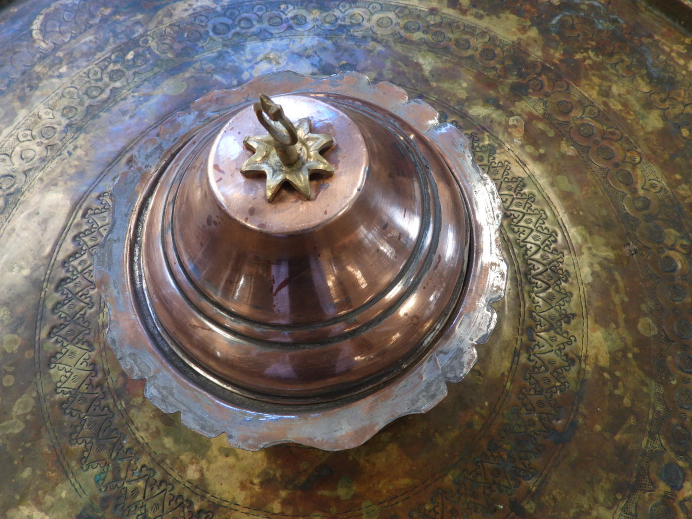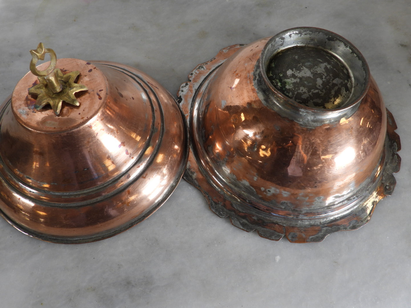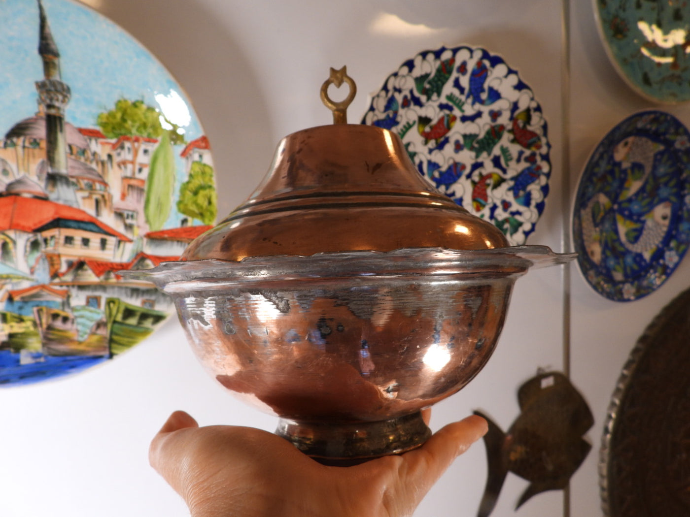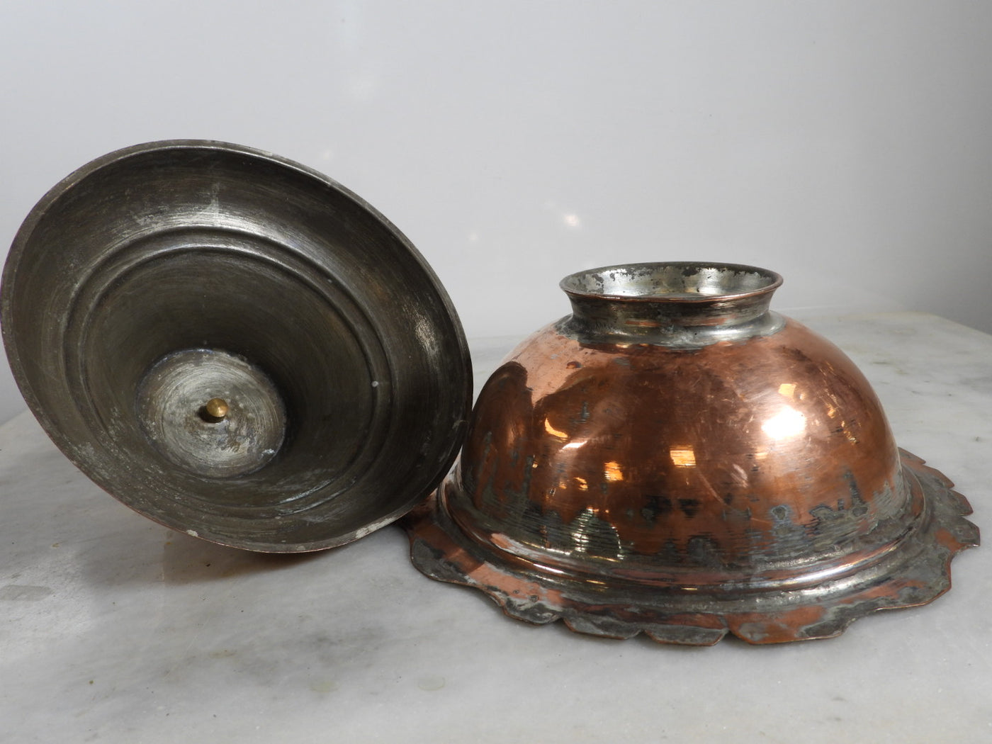 This is an attractive, vintage, tinned copper serving dish, distinguished by its classic Turkish design and brass star lid finial.