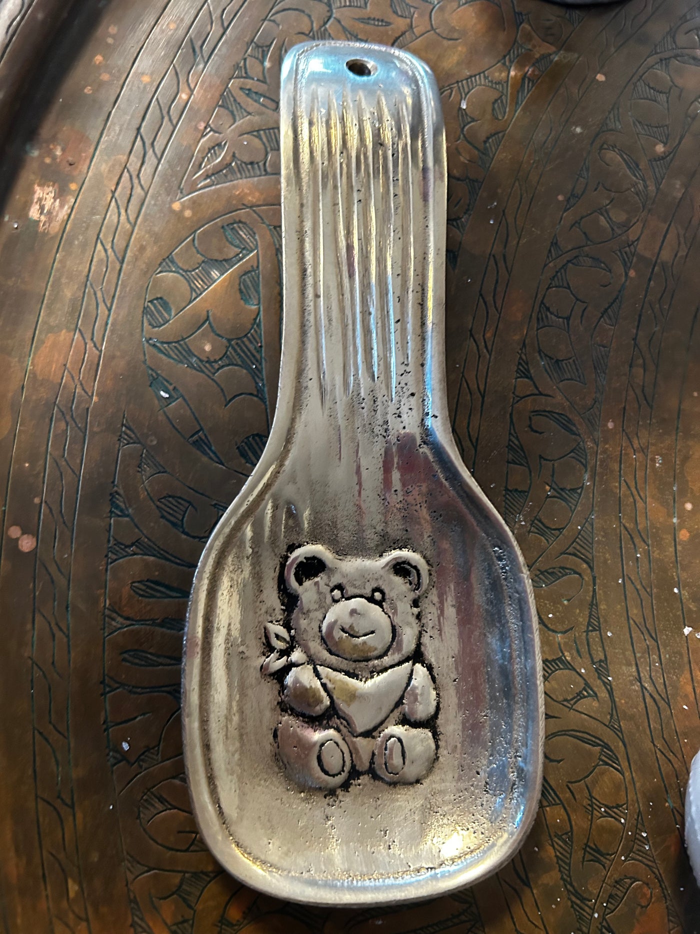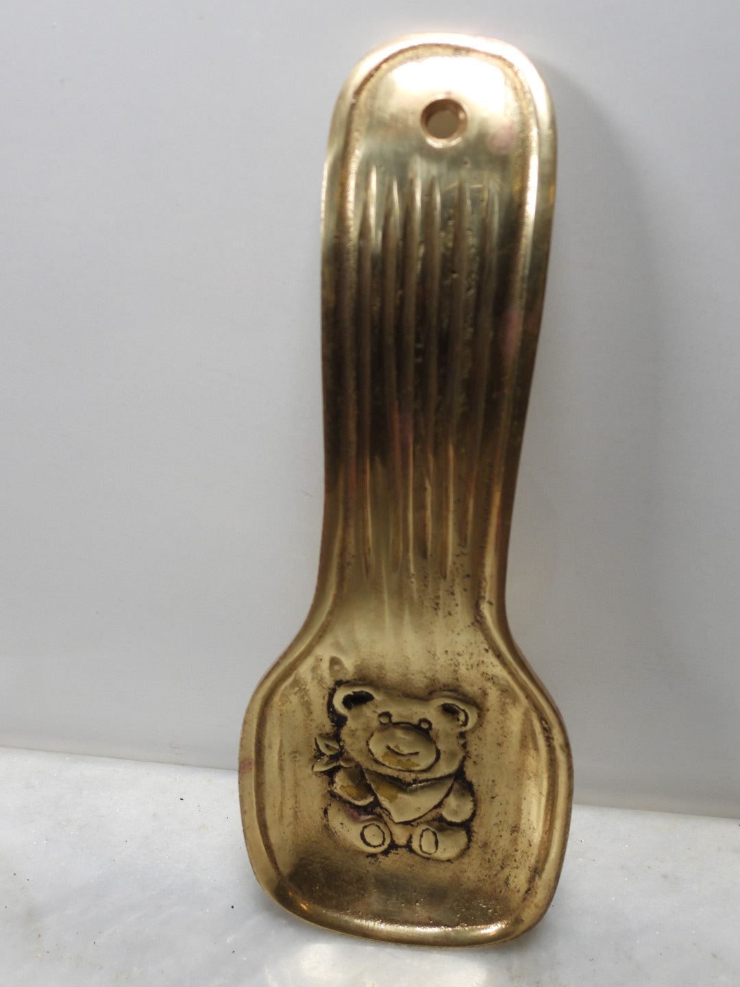 Add a touch of vintage charm to your kitchen with this adorable solid brass teddy bear spoon rest. Featuring a beautifully detailed embossed bear design and a classic grooved handle, this piece is both functional and decorative. It includes a pre-drilled hole at the top, allowing you to hang it as wall decor when not in use. Perfect for cottagecore kitchens or as a unique gift for bear lovers!