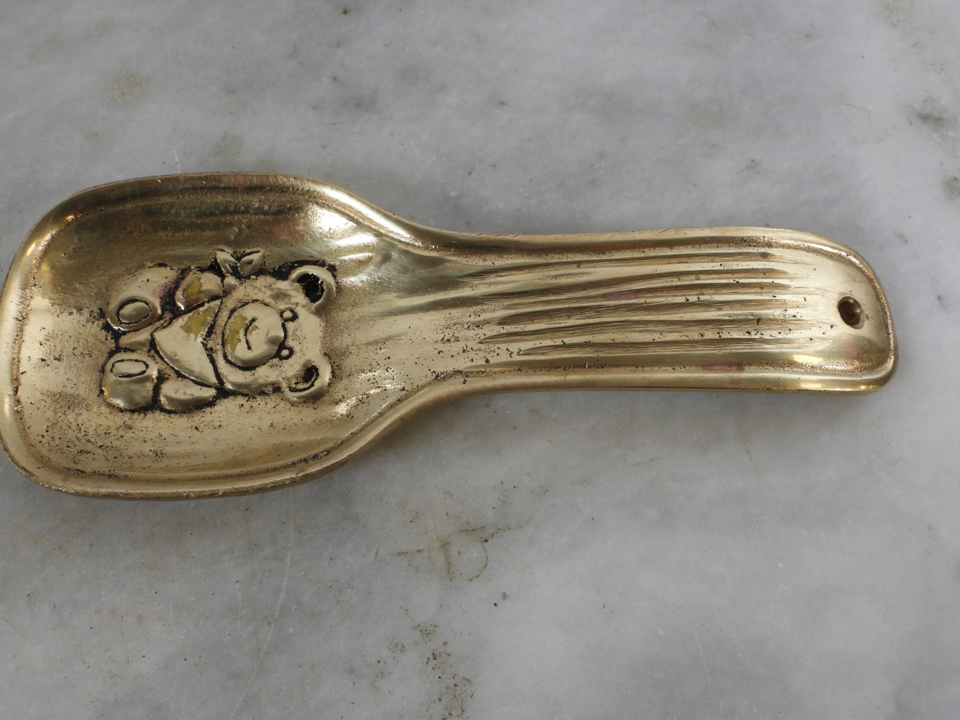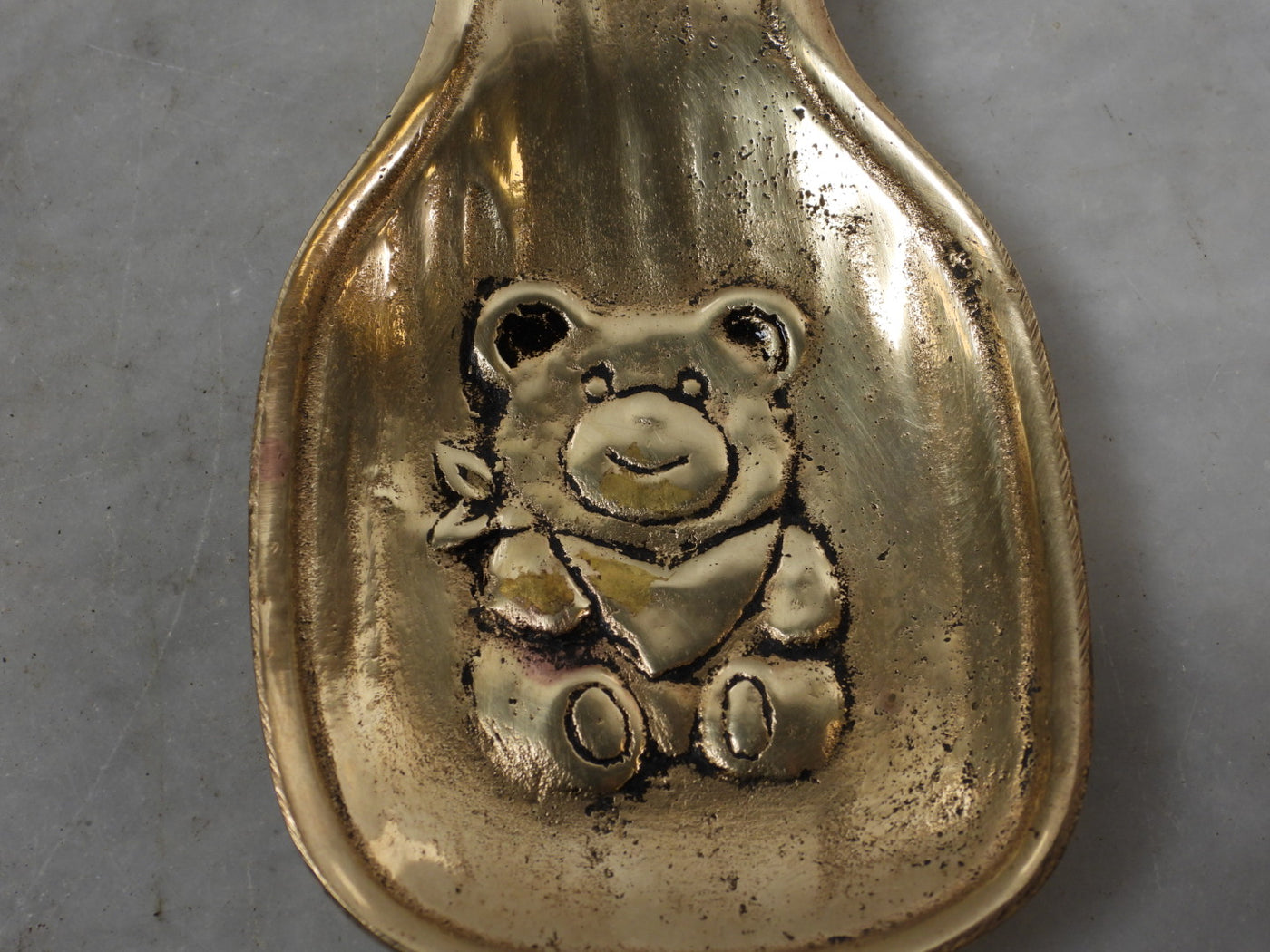 Rare find! This solid brass teddy bear spoon rest, manufactured in 1990. It has never been used and comes from a vintage warehouse stock.