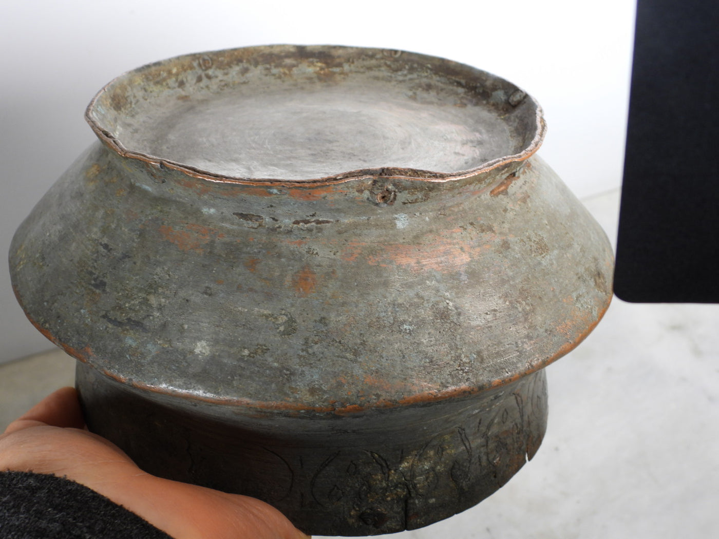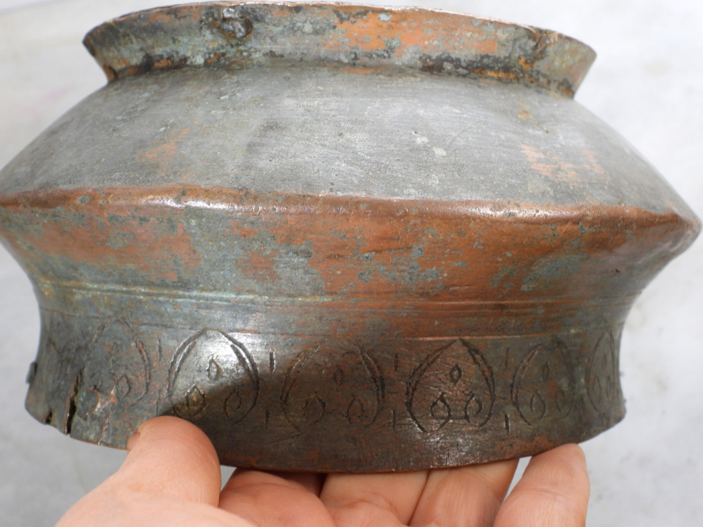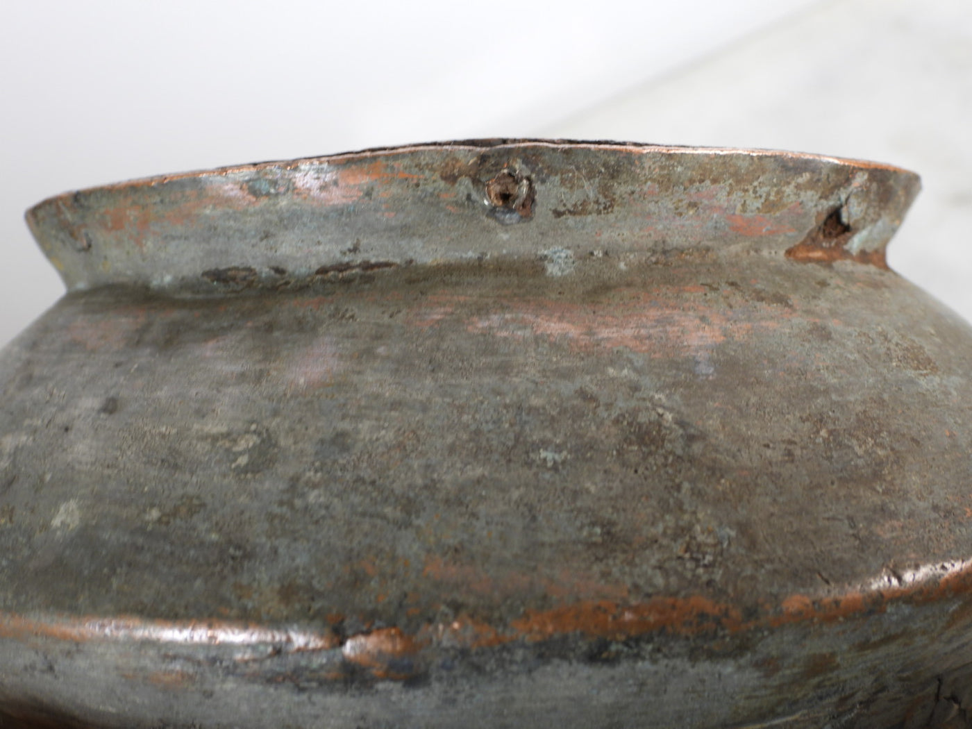 This piece is a true antique and carries the marks of its long journey. It features small cracks in one or two areas along the rim and body, along with visible historical repairs. These are not seen as flaws, but as an authentic "wabi-sabi" aesthetic that proves its age and genuine primitive origin. The heavy patina and oxidation further enhance its rustic charm.
