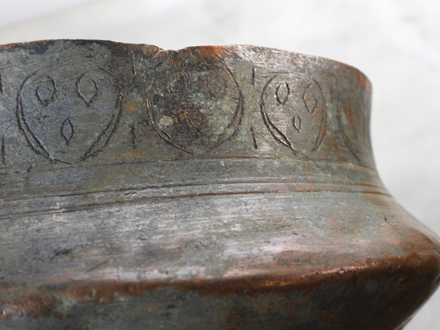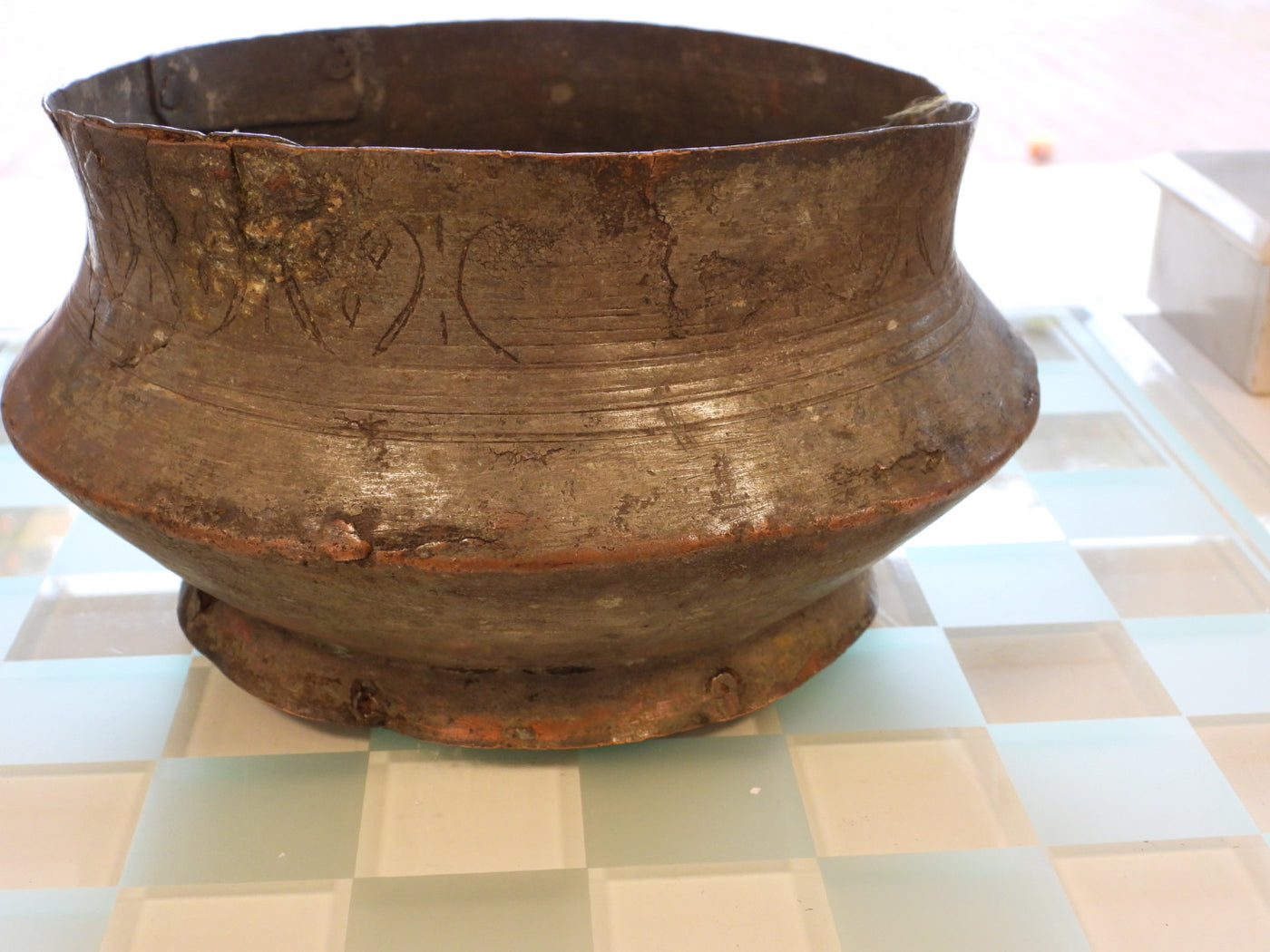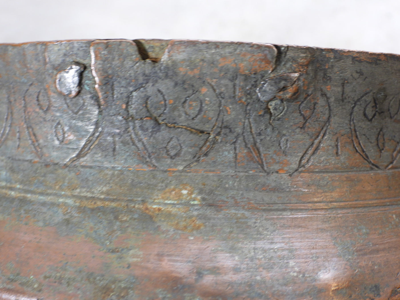 This piece is a true antique and carries the marks of its long journey. It features small cracks in one or two areas along the rim and body, along with visible historical repairs. These are not seen as flaws, but as an authentic "wabi-sabi" aesthetic that proves its age and genuine primitive origin. The heavy patina and oxidation further enhance its rustic charm.