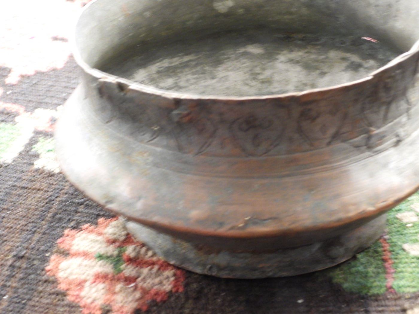 This authentic, hand-hammered copper bowl is a stunning example of traditional metalwork, rich with history and soul. It features delicate, hand-chiseled floral engravings around the rim, showcasing the artistry of its time.