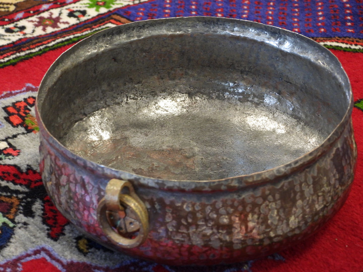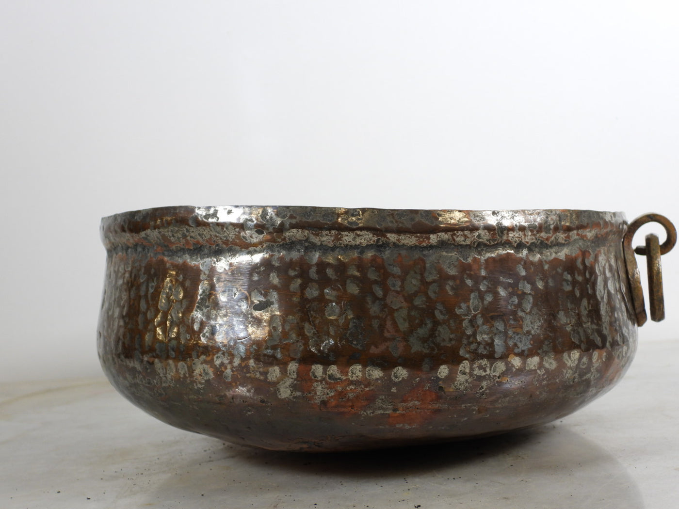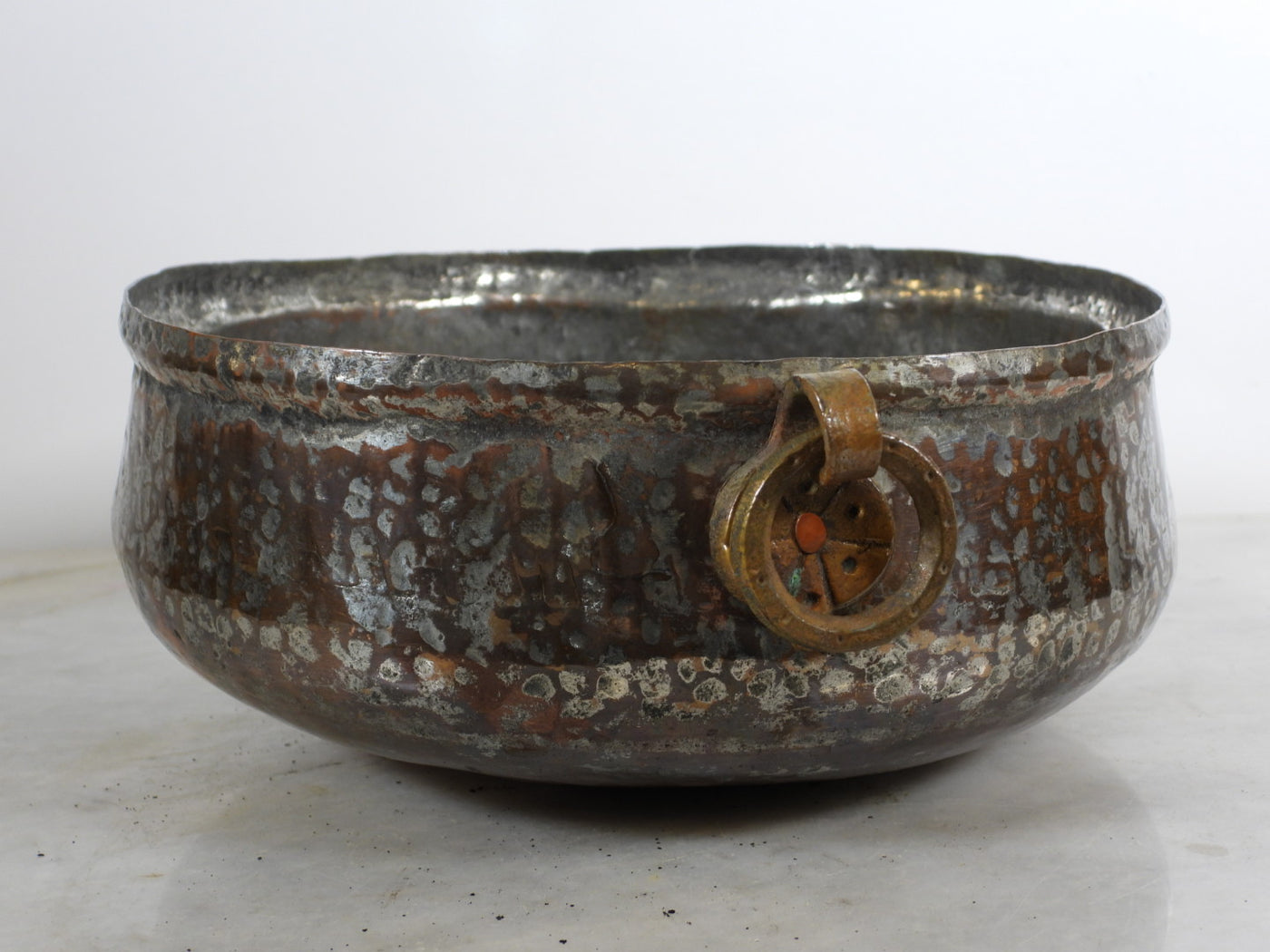 This is a stunning antique hand-hammered copper bowl, distinguished by its robust form and classic brass ring handles. This piece showcases the authentic soul of traditional metalwork, featuring visible hammer marks that tell the story of its handcrafted origin. Its deep, rich patina and sturdy construction make it a timeless addition to any antique collection or rustic interior.